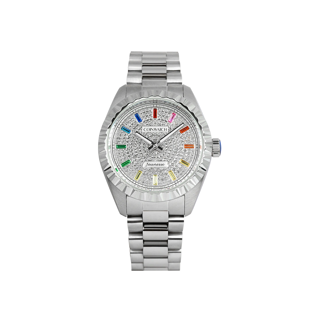 Argent avec 278 cristaux blancs et 12 cristaux colorés en forme de baguette